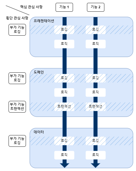 객체 지향 프로그래밍 (Object-Oriented Programming)의 심화 개념으로, OOP로 각 핵심 기능들을 모듈화 해 분리시켜 놓았다면, AOP는 그 분리시킨 모듈들이 가지고 있는 핵심 기능 이외의 공통적인 부분들을 다시 분리 시켜 핵심 기능을 수행할 때마다 해당 부분들을 불러오는 개발 방식을 의미한다. 스프링은 기능 호출 할 때마다 전처리, 후처리를 포함하는 디자인 패턴인 프락시 패턴을 이용해 AOP 기능을 제공하고 있다.